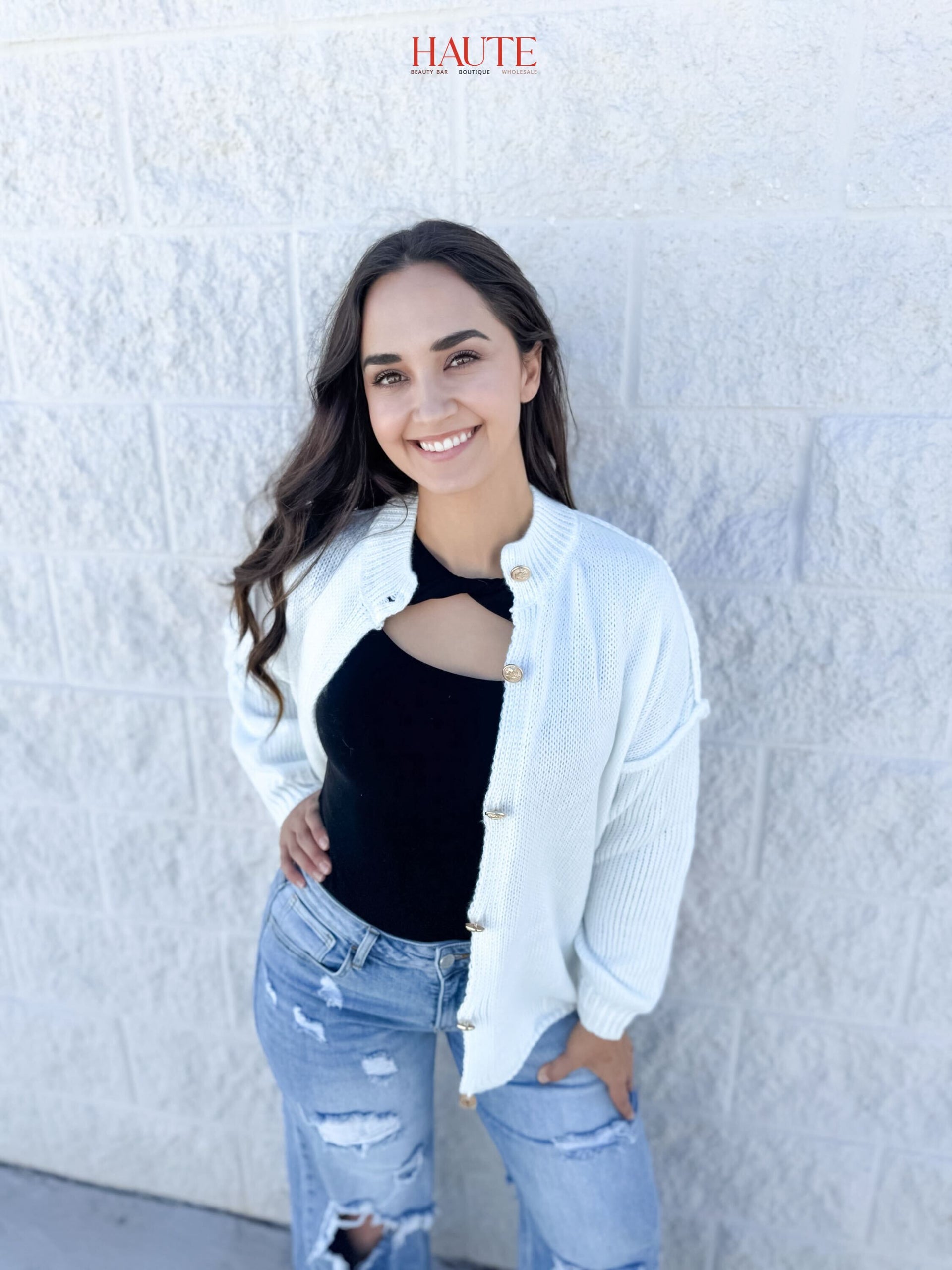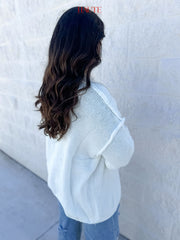 Gold button up cardigan offered in white. This sweater is perfect for any outfit or occasion.
