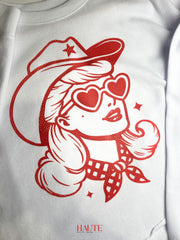 Sweet with a little sass, the Heartbreaker Cowgirl Cropped Crew Sweatshirt brings playful Western charm to your everyday look. Featuring a bold red graphic of a chic cowgirl in heart-shaped sunglasses, this white cropped sweatshirt blends retro flair with modern attitude. Made from soft, cozy fabric with a relaxed cropped fit, it pairs perfectly with high-waisted denim or leggings. Cute, confident, and full of personality—this crew is made for girls who like their style with a wink and a little wild spirit ❤️🤠✨