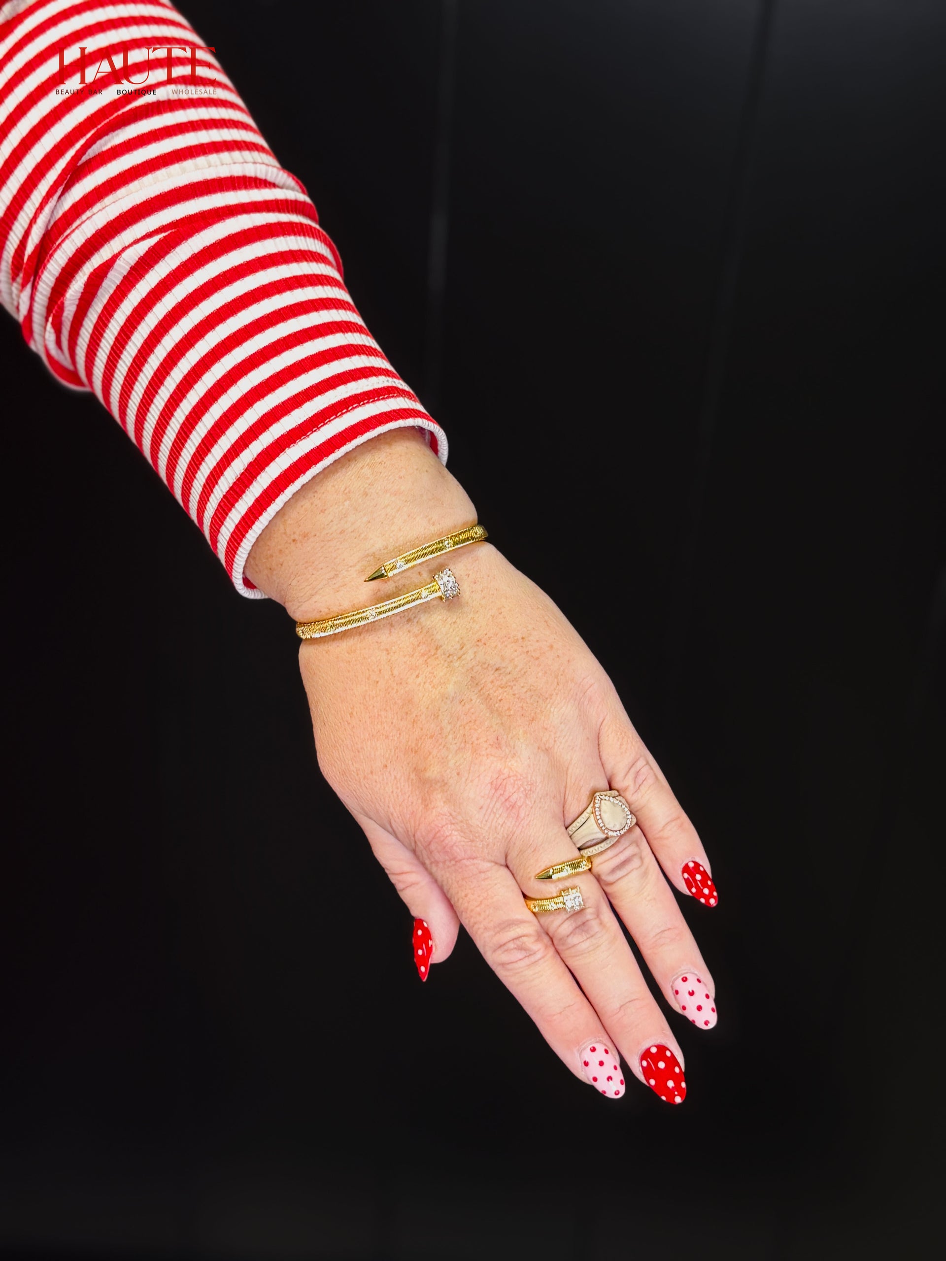 Turn up the glam with the High Voltage Bracelet—a dazzling take on edgy sophistication. Designed to resemble a sleek, polished nail and encrusted with brilliant rhinestones, this bracelet delivers a shock of sparkle with every flick of the wrist. Perfect for stacking or wearing solo, it’s the ultimate power piece for those who electrify every room they enter.
