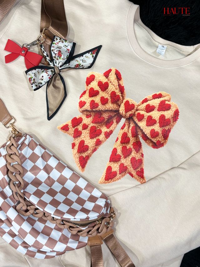 The Homebody Club Sweatshirt, Out-of- Pocket Crossbody Bag in the Pink Bows, & the Haute Sparkle Collar in White.