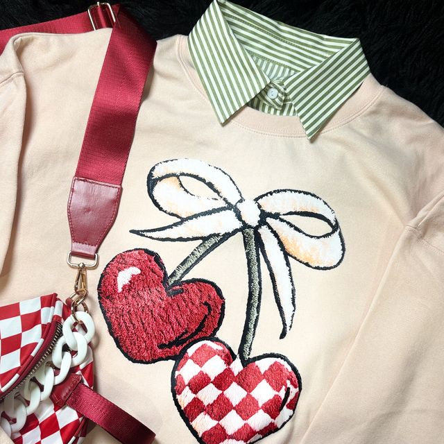 Sweet Cherry Sweatshirt, Out-of-pocket Crossbody Bag in Red Checkered & Haute Classic Collar in Green.